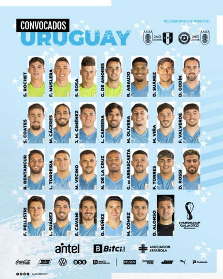 Delanteros: Diego Rossi (Fenerbahce), Facundo Pellistri (Alavés), Luis Suárez (Atlético de Madrid), Edinson Cavani (Manchester United), Darwin Núñez (Benfica) y Maxi Gómez (Valencia).
